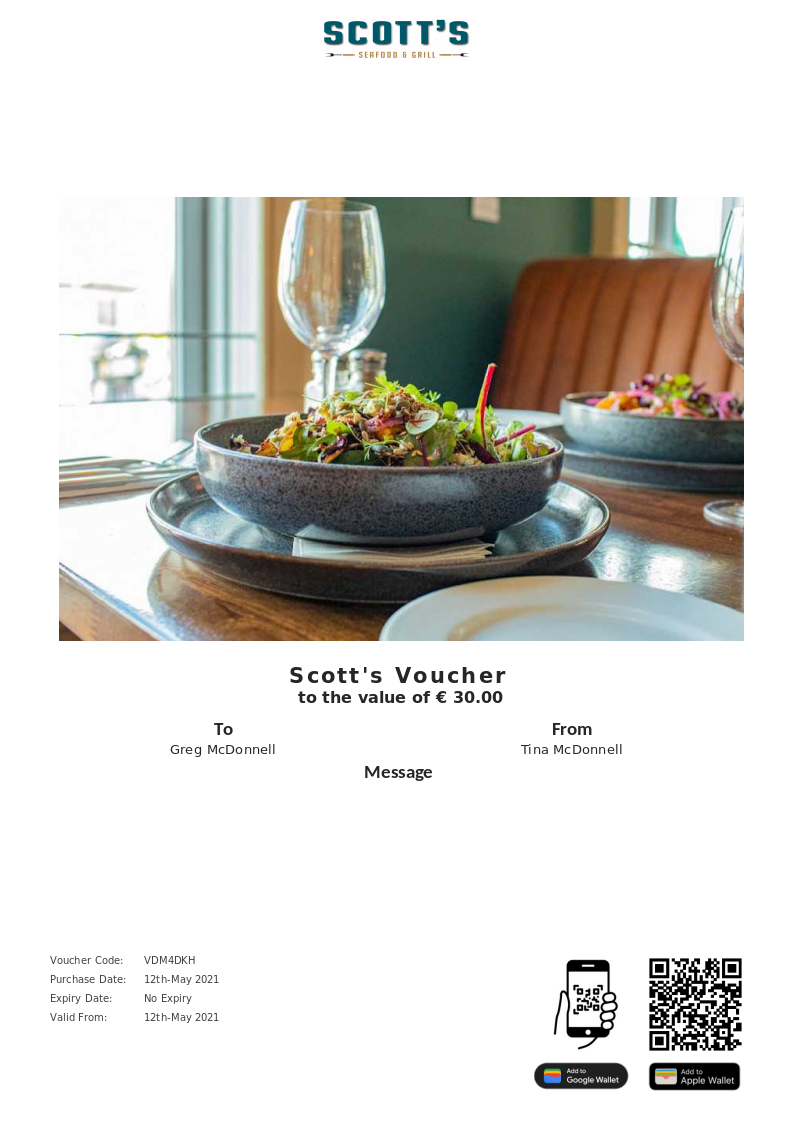 Scott's allows you to purchase instantly printable gift vouchers, special offers and tickets using the Voucher Connect platform.